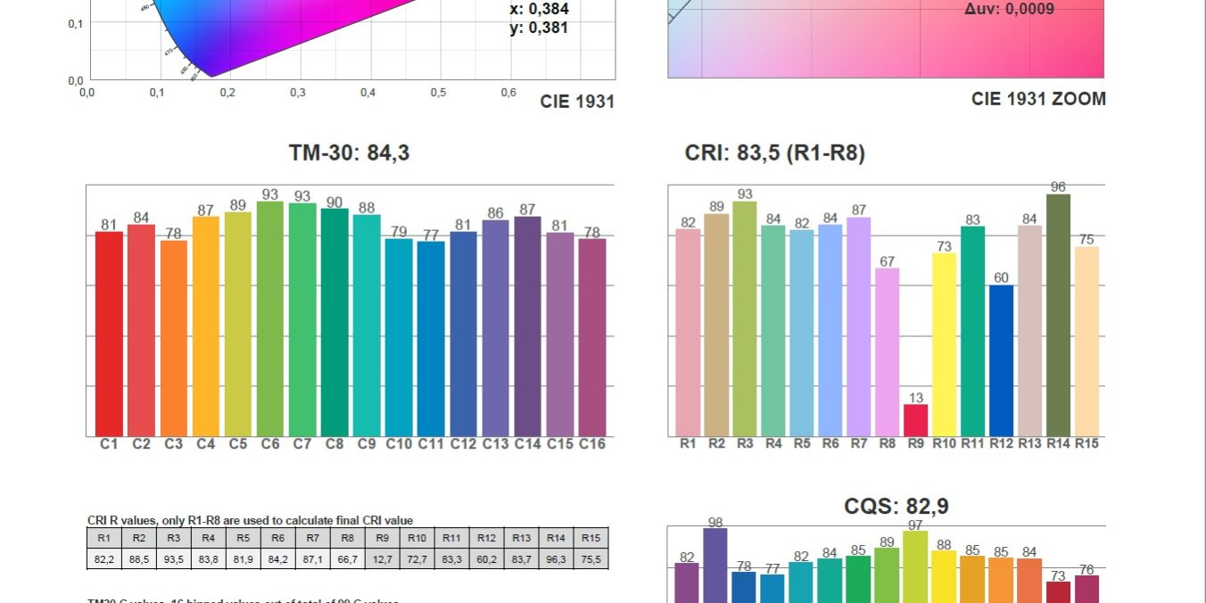 To adapt to LED sources, a new measurement method has emerged, the TM-30. The CRI is measured on 16 points, the TM-30 on 100. This takes into account notions such as fidelity, distortion of the light spectrum, saturation and many more. To illustrate, find below extracts of photometric capture of our Sunlike LED ribbon, the best color rendering